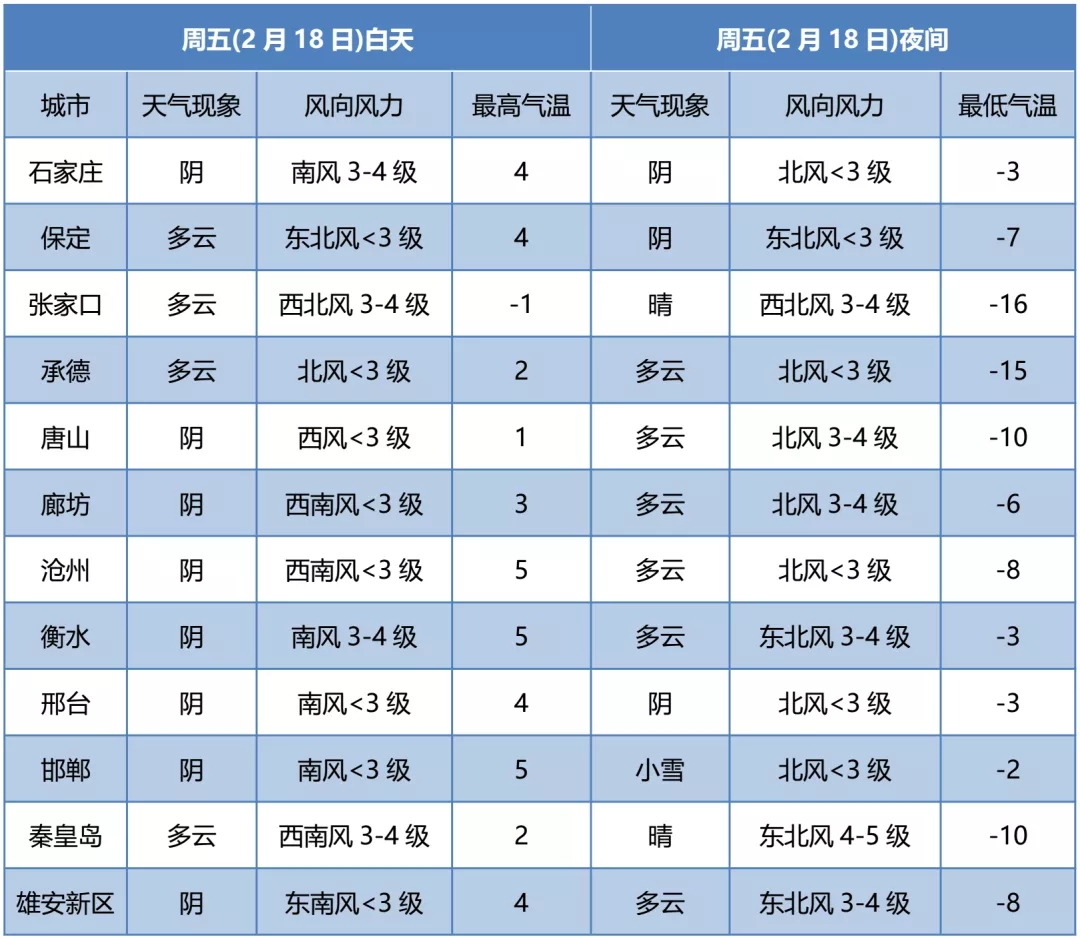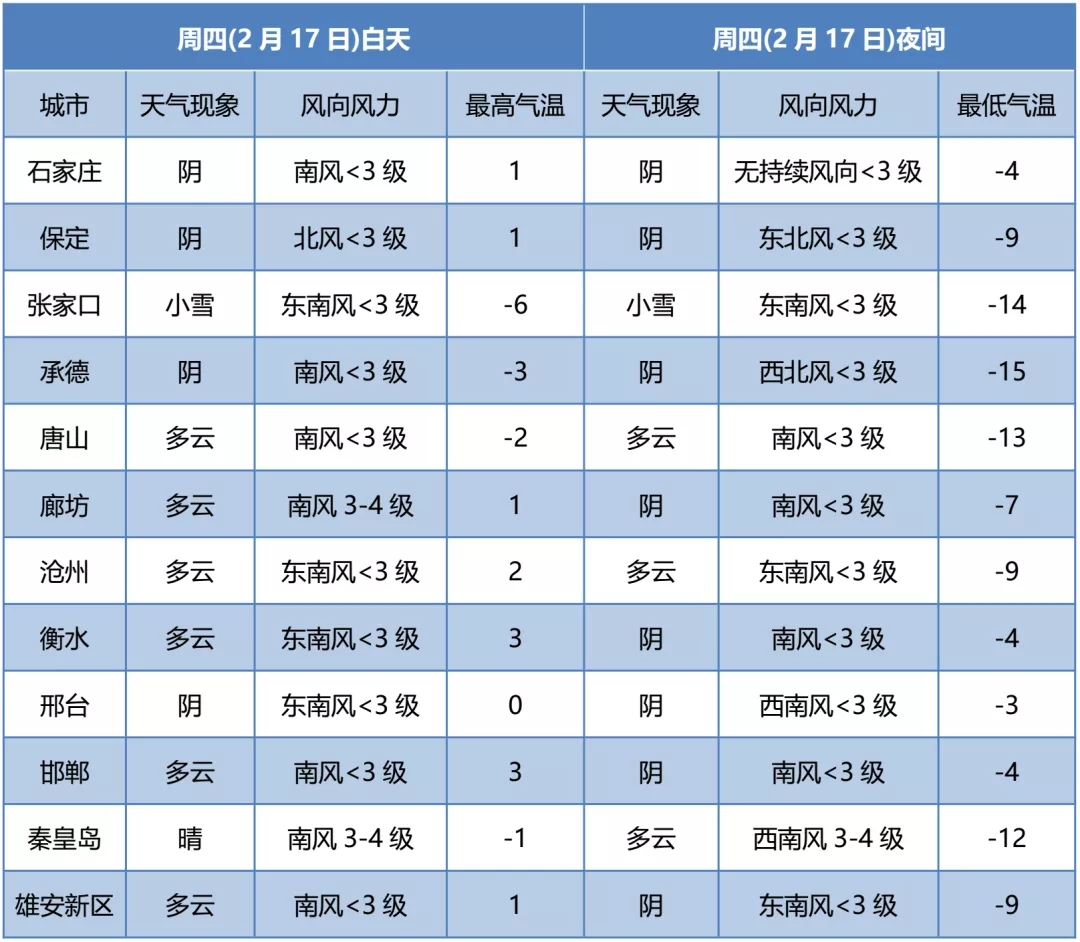 17日夜间到18日,张家口、承德、保定西北部和石家庄、邢台、邯郸三个地区的西部阴有小雪或零星小雪,其他地区多云间阴。